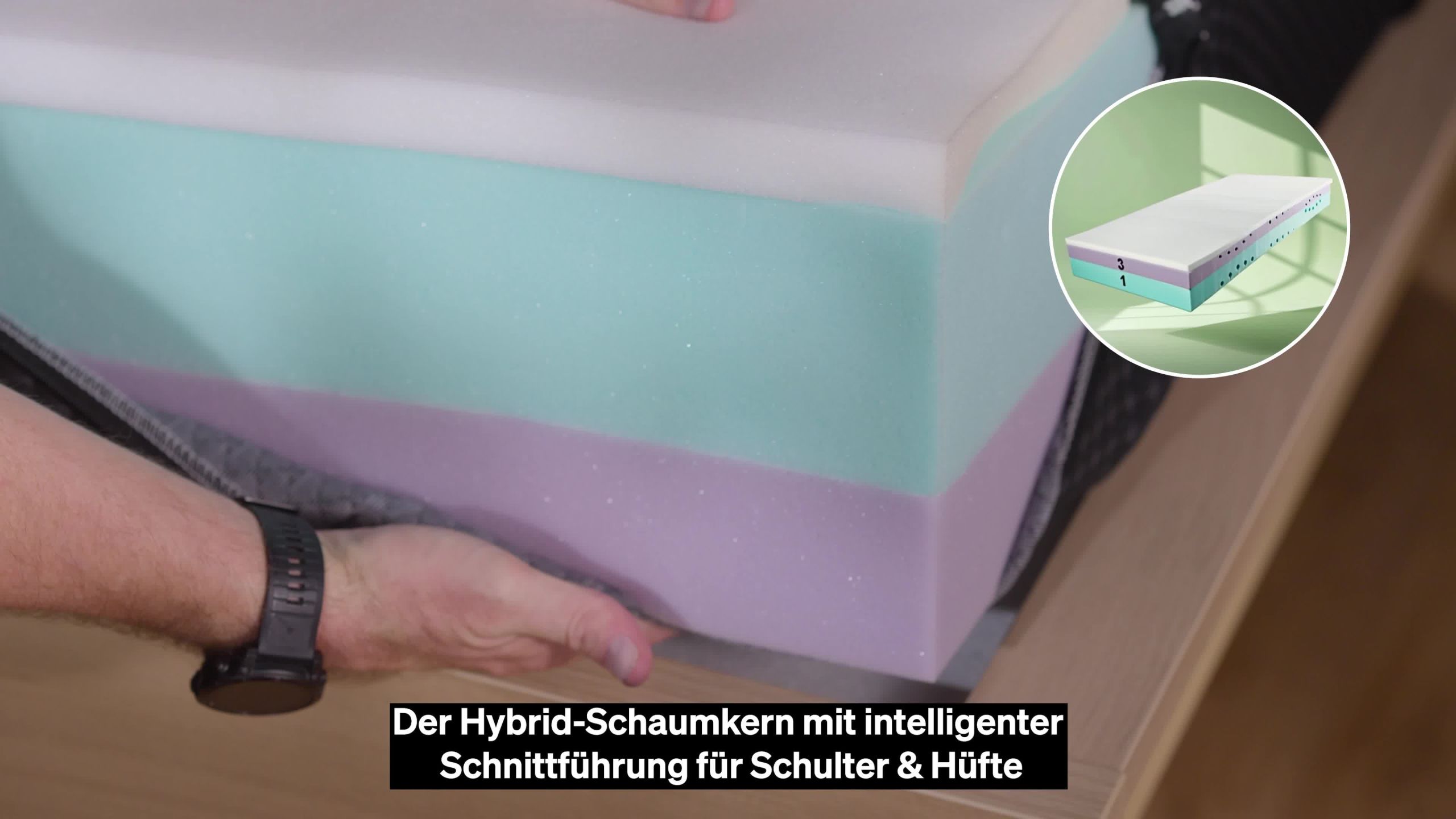 Der Schaumkern besteht aus zwei verschiedenen Schaumschichten. Einer harten Seite (lila) und einer weichen Seite (grün). Vergleicht man die Härtegrad-Angabe mit anderen Herstellern, dann entspricht die grüne Seite einem Härtegrad von H2 und die lila Seite einem Härtegrad von H4. Je nachdem, wie du den Kern wendest, schläfst du auf der harten oder weichen Seite. Zudem beinhalten beide Schaumschichten ein spezielles Schnittmuster für Seitenschläfer, damit Schultern und Becken einsinken können. Schläfst du primär auf dem Rücken oder auf dem Bauch, kannst du den Kern um 180 Grad drehen, sodass dein Oberkörper auf dem stützenden Teil liegt.