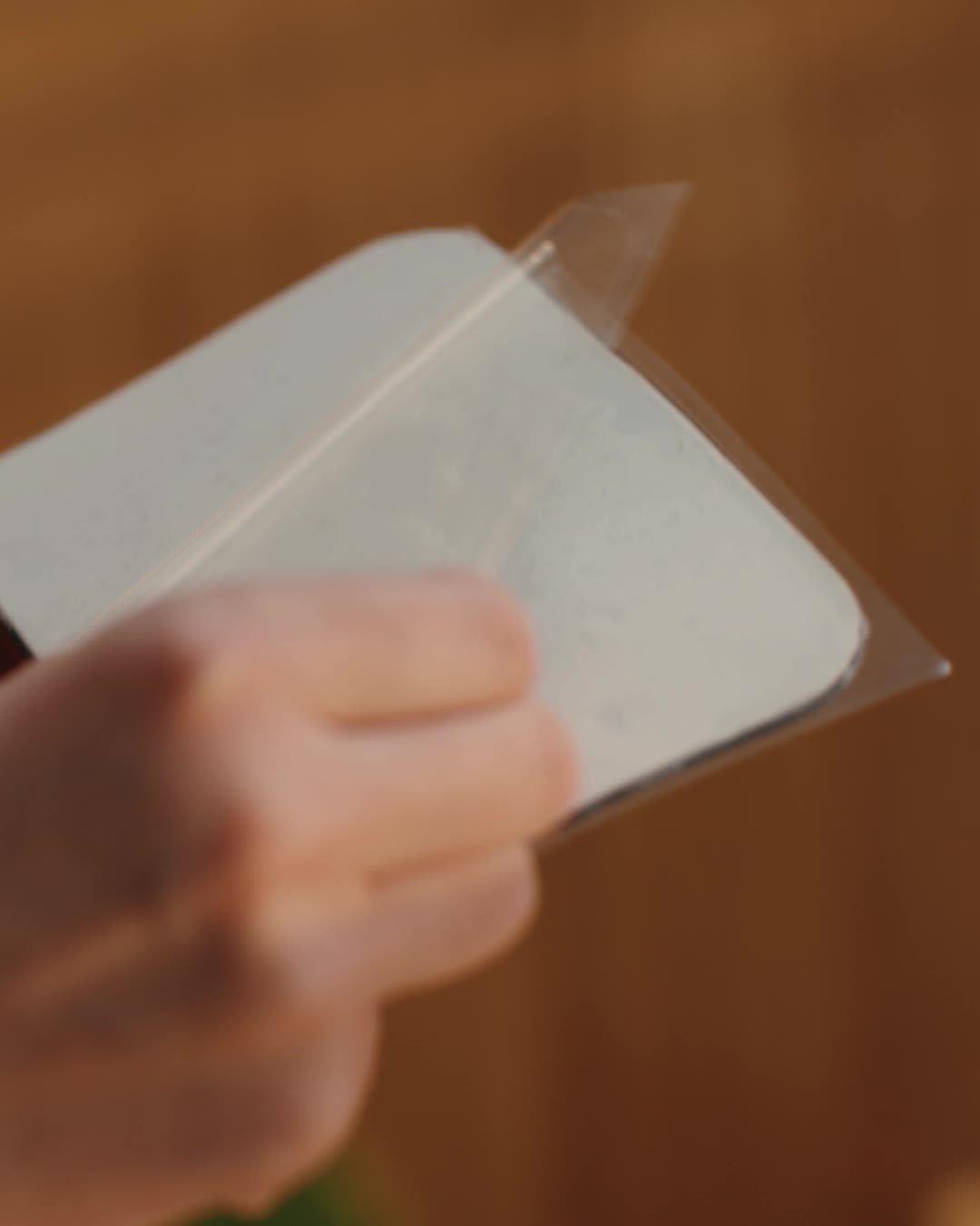 Lege die Klebefolie mit Seite A nach oben auf eine saubere, ebene Oberfläche. Entferne zunächst eine Hälfte der Schutzfolie von Seite A und positioniere das THERMO PAD passgenau auf dieser freigelegten Fläche. Anschließend entfernst du die zweite Hälfte der Schutzfolie und drückst das THERMO PAD gleichmäßig auf die Folie, sodass eine flächige und sichere Verbindung entsteht.