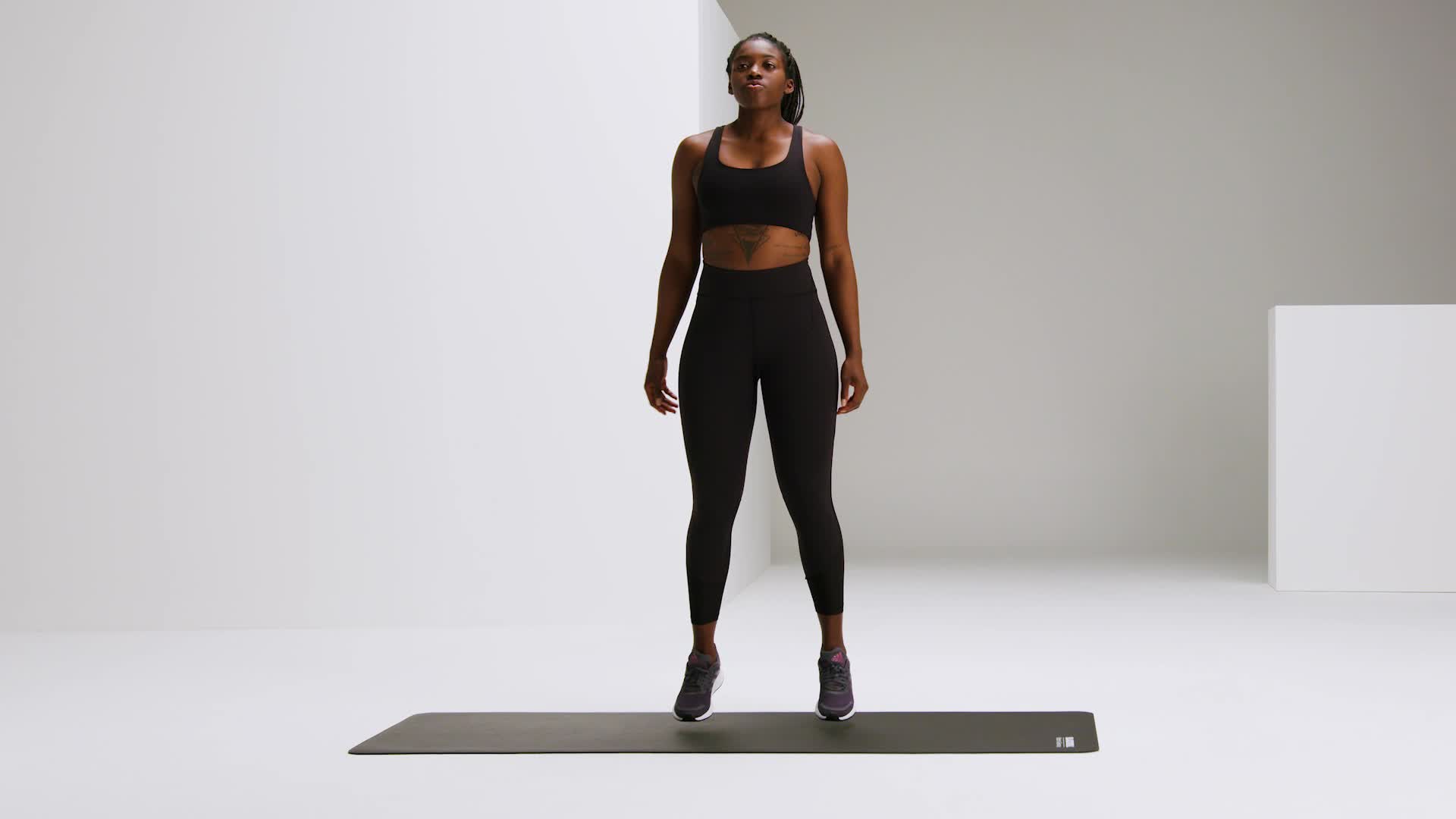 Stand in an upright position, feet hip-width apart. Keep a slight bend in your knees. Do gentle bouncing movements on the spot.